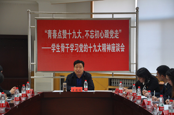 11月13日下午,我校召开“青春点赞十九大、不忘初心跟党走”——学生骨干学习党的十九大精神座谈会。学校副校长王清明出席会议。校院两级学生会骨干代表、校级学生社团骨干代表参加了座谈会。