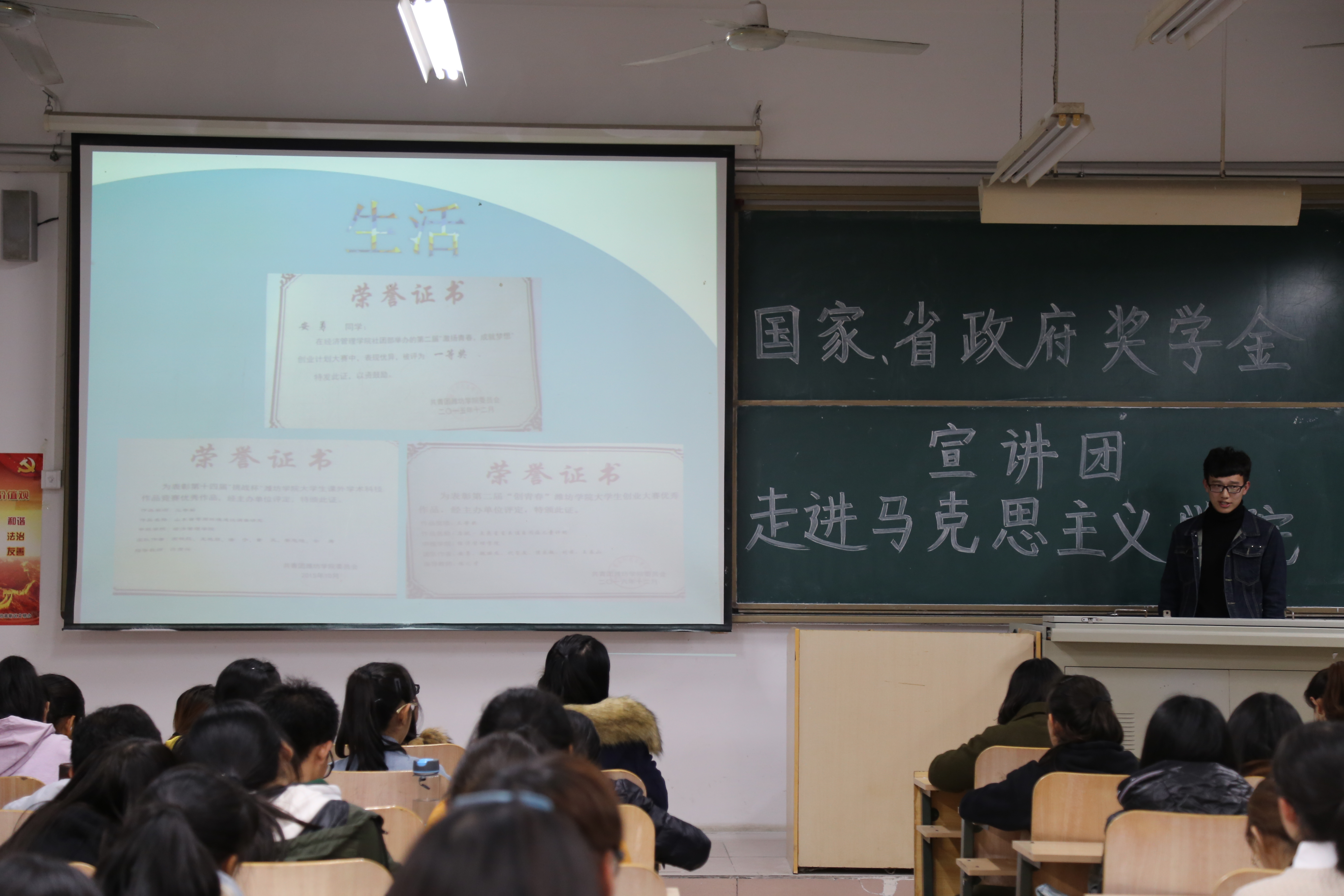 为弘扬积极向上努力奋进的学风,鼓励广大同学在学习工作中力争佳绩,2017年11月8日晚,马克思主义学院大一大二学生于致远楼6112教室积极参加了国家、省政府奖学金宣讲团走进马克思主义学院活动。