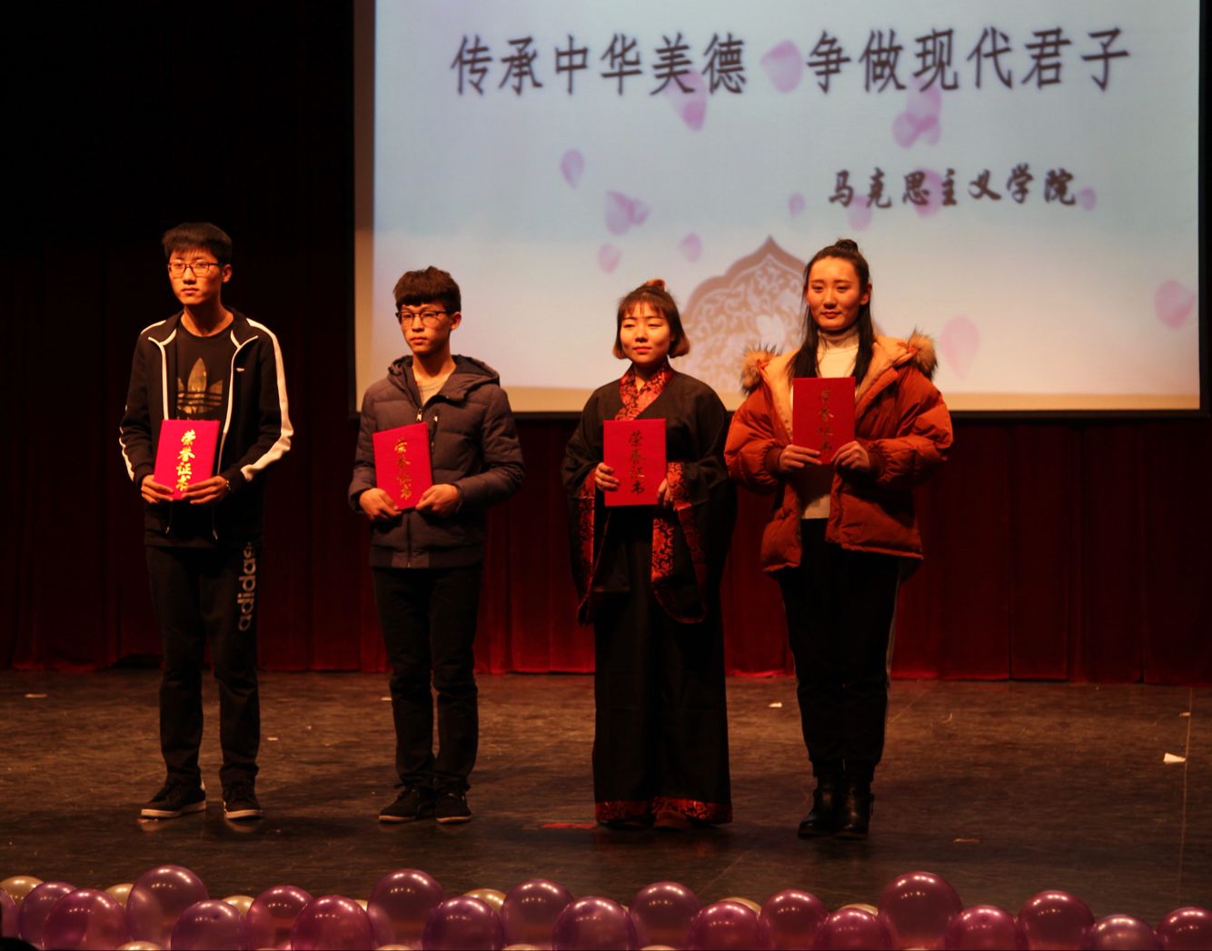为传承优秀传统文化,弘扬中华传统美德,由马克思主义学院实验实训中心、学生工作办公室、团总支联合主办的“传承中华美德,争做现代君子”孔子学堂主题晚会于2017年12月1日晚7点在闻韶楼报告厅举行。出席晚会的领导嘉宾有潍坊学院团委书记张晓静、马克思主义学院党总支书记陈子文,院长刘勇以及名师工作室教授魏晓笛等老师。