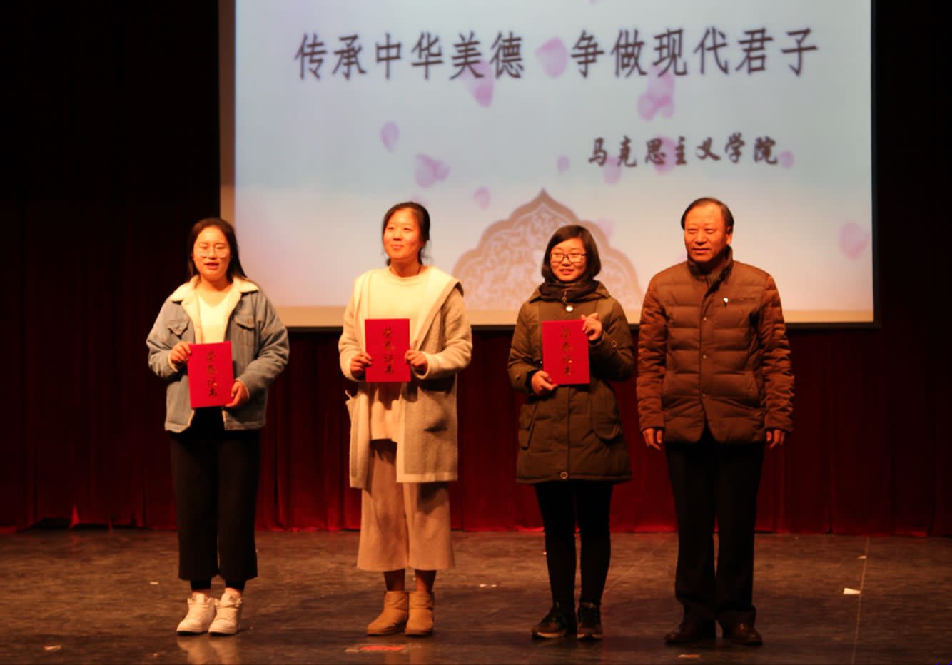 评选结果公布后,由到场领导为获奖节目颁奖,获得一等奖的节目是歌曲《说孔子》,获得二等奖的节目是舞蹈《采薇》和话剧《兰之猗猗》,获得三等奖的节目是歌曲《蒹葭》、《千年游》和《礼乐之邦》,获得优秀奖的节目是诗朗诵《孔子祭文》、《论语节选》、歌曲《孔子是个好老师》和话剧《君子固穷》。最后,刘勇院长为大家致闭幕词,并希望大家在以后能够齐心协力,继承发扬优秀传统文化,扎实学习专业知识,勤奋学习,努力工作,共同促进学院发展。