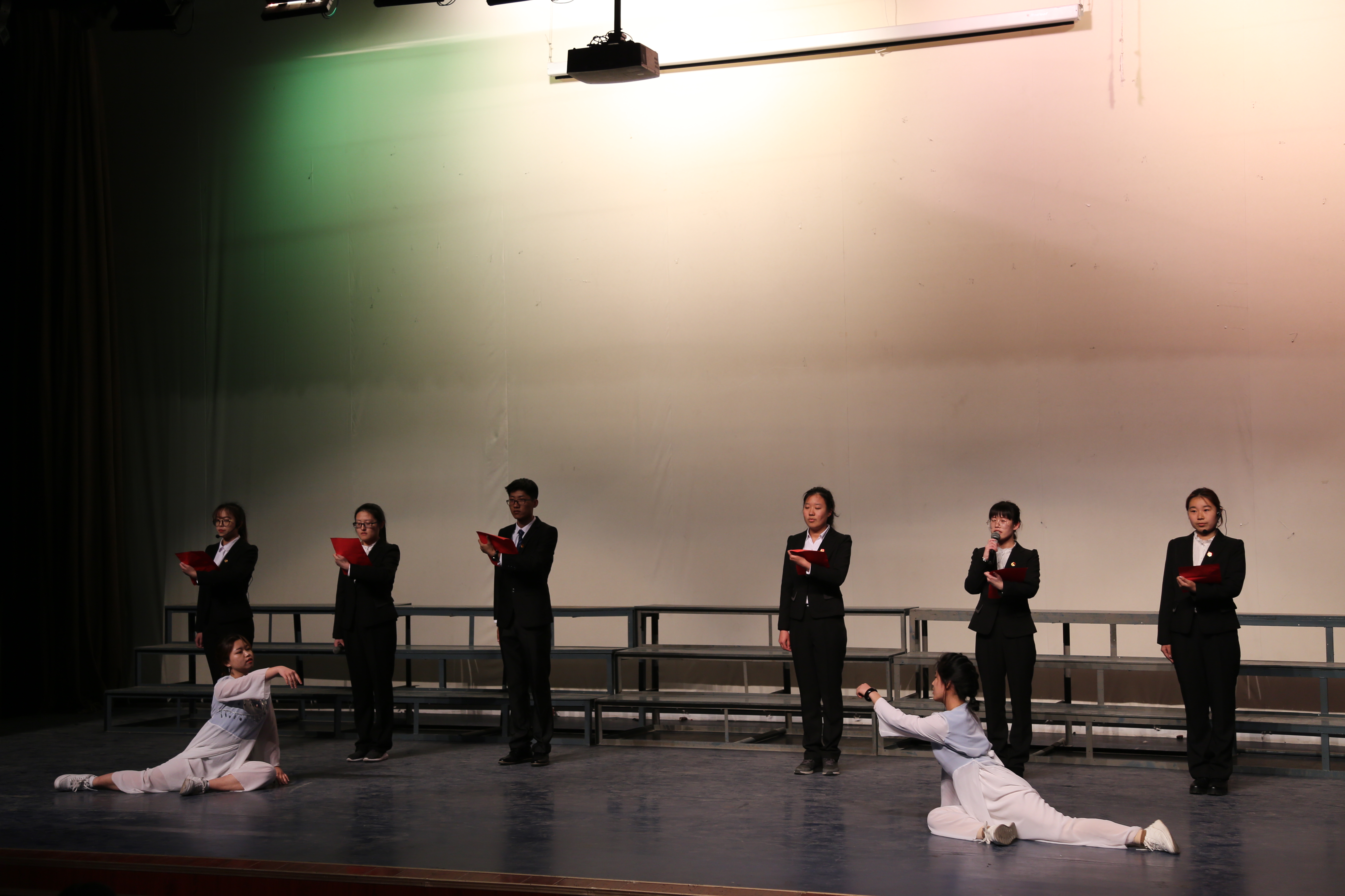 首先主持人简要介绍了本次比赛评委老师并宣布比赛正式开始开始。首先上场的是数学学院,整齐的方队、精致的舞美、充满感情的朗读将大家带入了诗与乐的海洋中,整个舞台充满诗情画意。各参赛团队依序上台,展示自身特色,不断创下新的最高分数。马克思主义学院参赛队是第十七支参赛队伍,他们随着庄严的音乐缓缓走上舞台,灯光不断变幻,映衬着同学们认真坚毅的脸庞;伴舞舞姿曼妙,传递出羽衣霓裳之美;他们的朗诵铿锵有力,掷地有声,一字一句,将《在马克思墓前的讲话》和《共产党宣言》庄严地传递给大家,让大家感受到了无产阶级伟大导师马克思的崇高人格和伟大理念,将整体气氛带到了高潮。