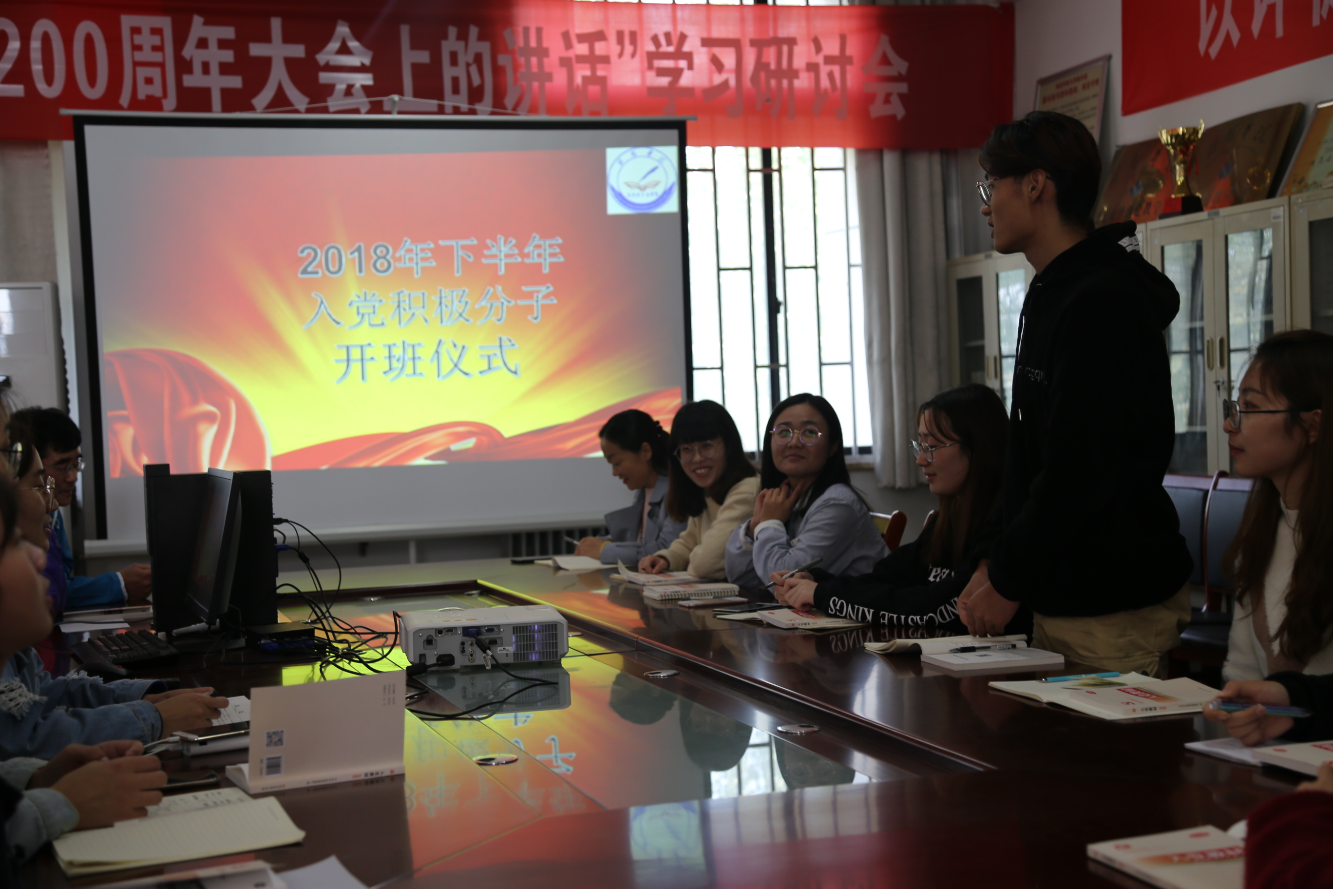 为了使入党积极分子树立正确的观念,完善自己,更好的适应党和国家的需求,积极为人民服务,马克思主义学院于2018年10月25日在齐贤楼2501召开了以“2018年下半年入党积极分子开班式”为主题的活动。党总支书记陈子文,学生工作办公室主任赵静及13位入党积极分子参加了本次活动。