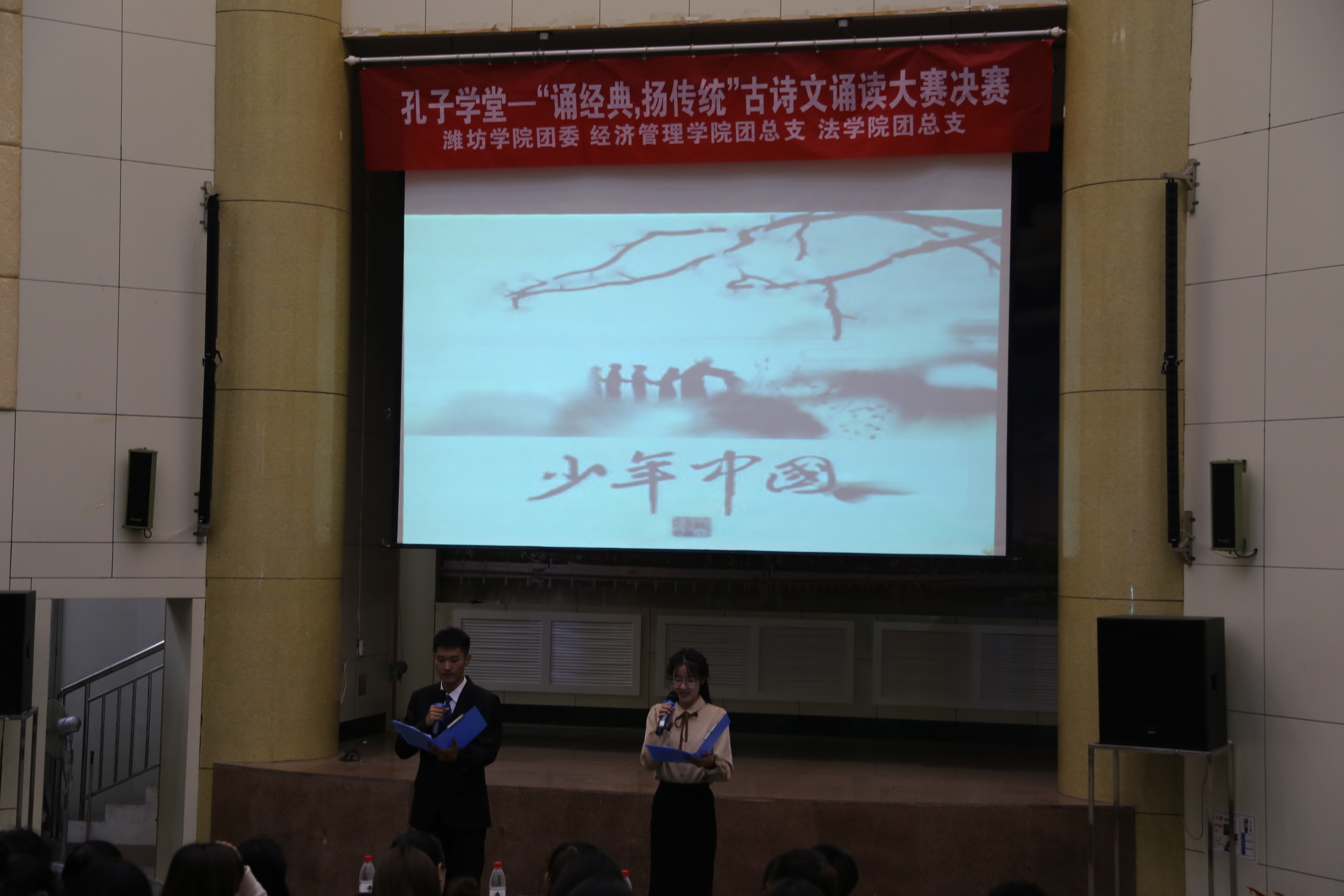 为深入贯彻落实党的十九大精神和学校第三次党代会精神,引导学生研读经典美文,加强文化传承创新,2018年11月4日法学院团总支、经济管理学院团总支、法学院学生会、经济管理学院学生会以及鸢飞汉服社和春华文学社于行政楼报告厅联合举办孔子学堂——“诵经典,扬传统”为主题的古诗文诵读大赛决赛。潍坊学院马克思主义学院邱琳同学和马超纪同学踊跃参加活动并且凭借他们的努力冲进决赛。