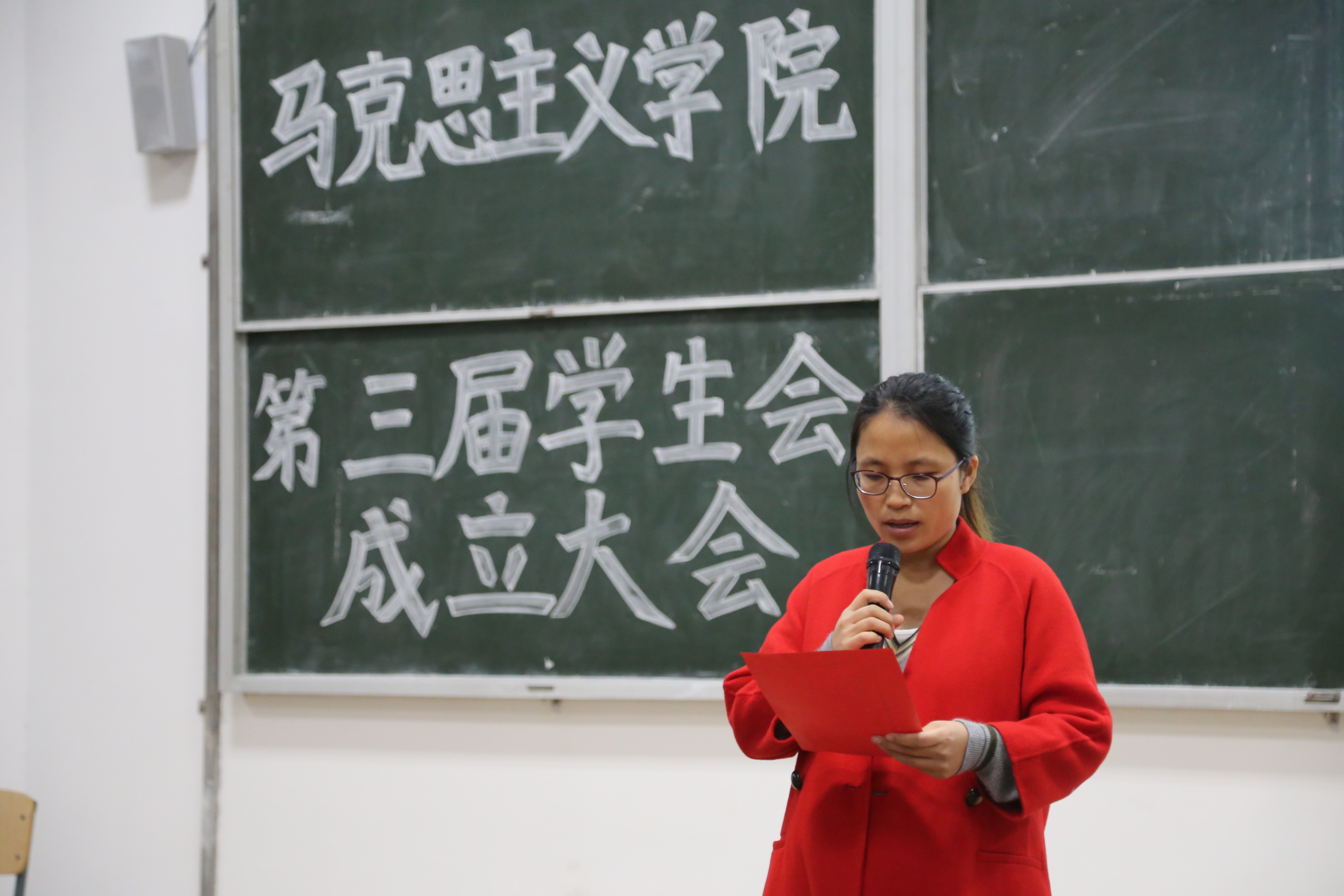 2018年11月11日,马克思主义学院第三届学生会成立大会于齐贤楼2109教室隆重举行。本次大会由学生会秘书长贾文娟主持,马克思主义学院党总支书记陈子文、学生工作办公室主任赵静、团总支副书记崔秀玲莅临指导,第三届学生会全体成员积极参加。