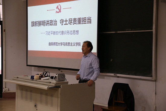 为全面贯彻党的十九大精神,加强同学们的思想政治教育,强化政治意识,2018年11月15日潍坊学院马克思主义学院于齐贤楼2210教室举办了“旗帜鲜明讲政治,守土责任重担当”的名家讲坛活动。马克思主义学院党总支书记陈子文、院长刘勇、副院长赵允福、于民以及全体老师和部分学生参与本次活动。