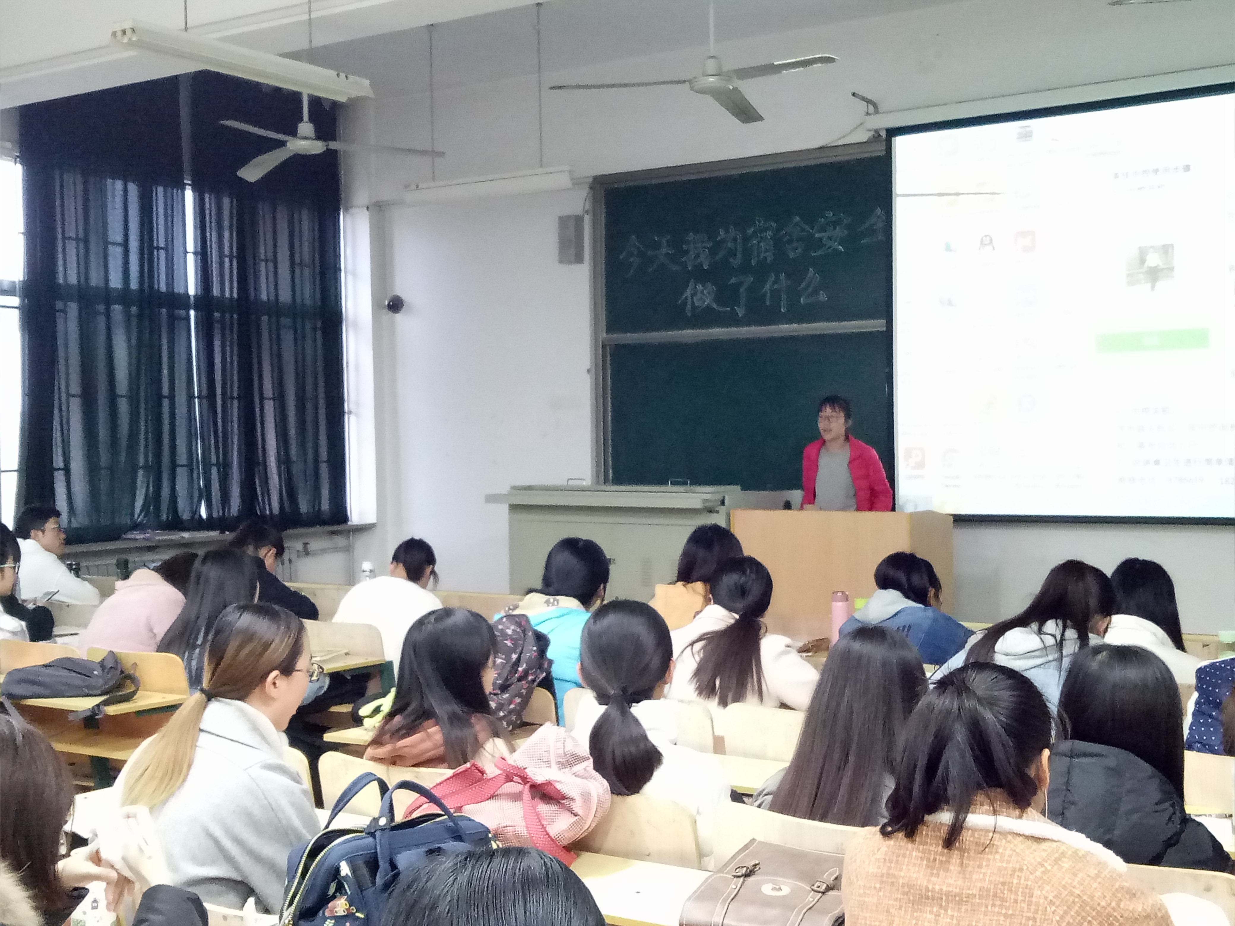 首先亓玫舒根据班级内部的特点,并结合自己的切身经历强调了宿舍内安全问题的具体注意事项,如在宿舍内电器的安全使用、宿舍出现安全意外后一些列具体的措施,以及电器的使用的时间和具体的注意事项。亓玫舒简言明了的说明了宿舍安全的重要性以及在细节问题的处理上的重要性,让每一个同学都能够结合自身平时在宿舍的表现,根据宿舍安全的具体的注意事项进行反思,并在未来的宿舍生活中加以保持改正。接下来由7148、7223两个宿舍的宿舍长来分享平时自身以及自己宿舍成员在宿舍安全问题上的经验以及对宿舍安全问题的看法。赵玲、何艺两位同学都从端正思想这一角度来理解宿舍安全问题,呼吁同学们要始终保持着安全意识,把宿舍安全问题放在宿舍所有问题的首位,宿舍才不会出问题,同学们也能够真的静下心来把时间用在学习上,其中,赵玲同学分享道:“每天出宿舍门时检查一下也花不了多长时间,但是对于安全问题上却是重要的一步。”。两位同学还分享了自己在宿舍安全问题上具体的做法,给班级内的其他同学提供了一定的参考。