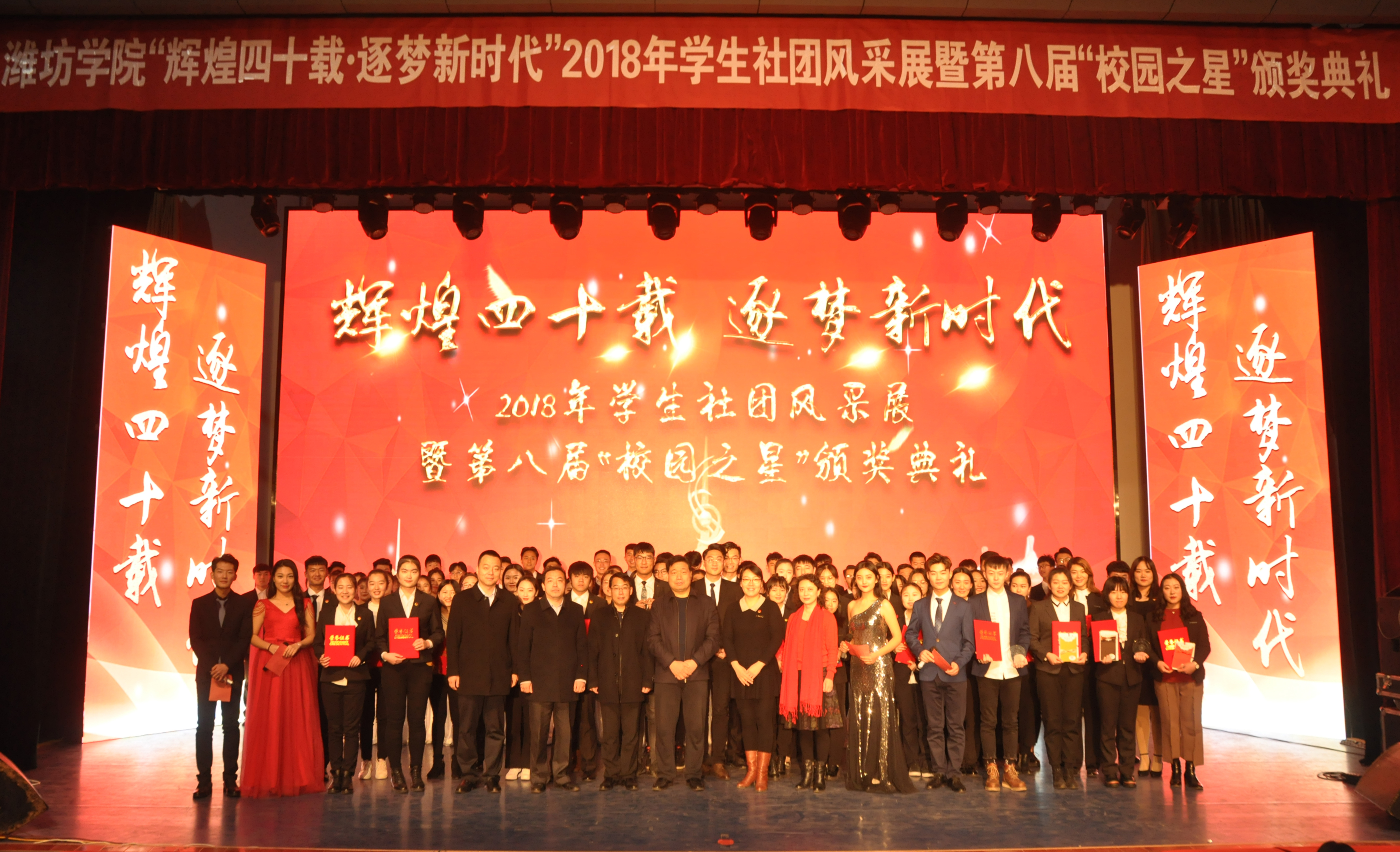 为深入学习贯彻习近平新时代中国特色社会主义思想、党的十九大精神和学校第三次党代会精神,丰富校园文化生活,浓厚学习风气,营造蓬勃昂扬、团结奋进的校园文化氛围,2018年12月13日潍坊学院于图书馆报告厅举行了“辉煌四十载,逐梦新时代”学生社团风采展暨第八届“校园之星”颁奖典礼,马克思主义学院在此次典礼中有一人获得青春活力之星,两人入围提名奖。
