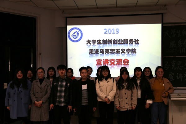 为响应李克强总理“大众创业,万众创新”的号召,营造浓厚的学院科技创新氛围,马克思主义学院于2019年3月13日晚在齐贤楼2210教室举行了大学生创新创业服务社走进马克思主义学院宣讲交流会活动。