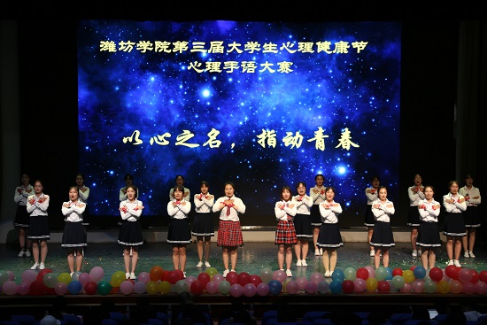 为迎接潍坊学院第三届大学生心理健康节,丰富校园艺术文化生活,让学生强身健体,表达内心,释放情绪,潍坊学院于2019年5月29日下午在图书馆报告厅举办了大学生“以心之名,指动青春”心理手语大赛。潍坊学院各二级学院代表队参加本次大赛。