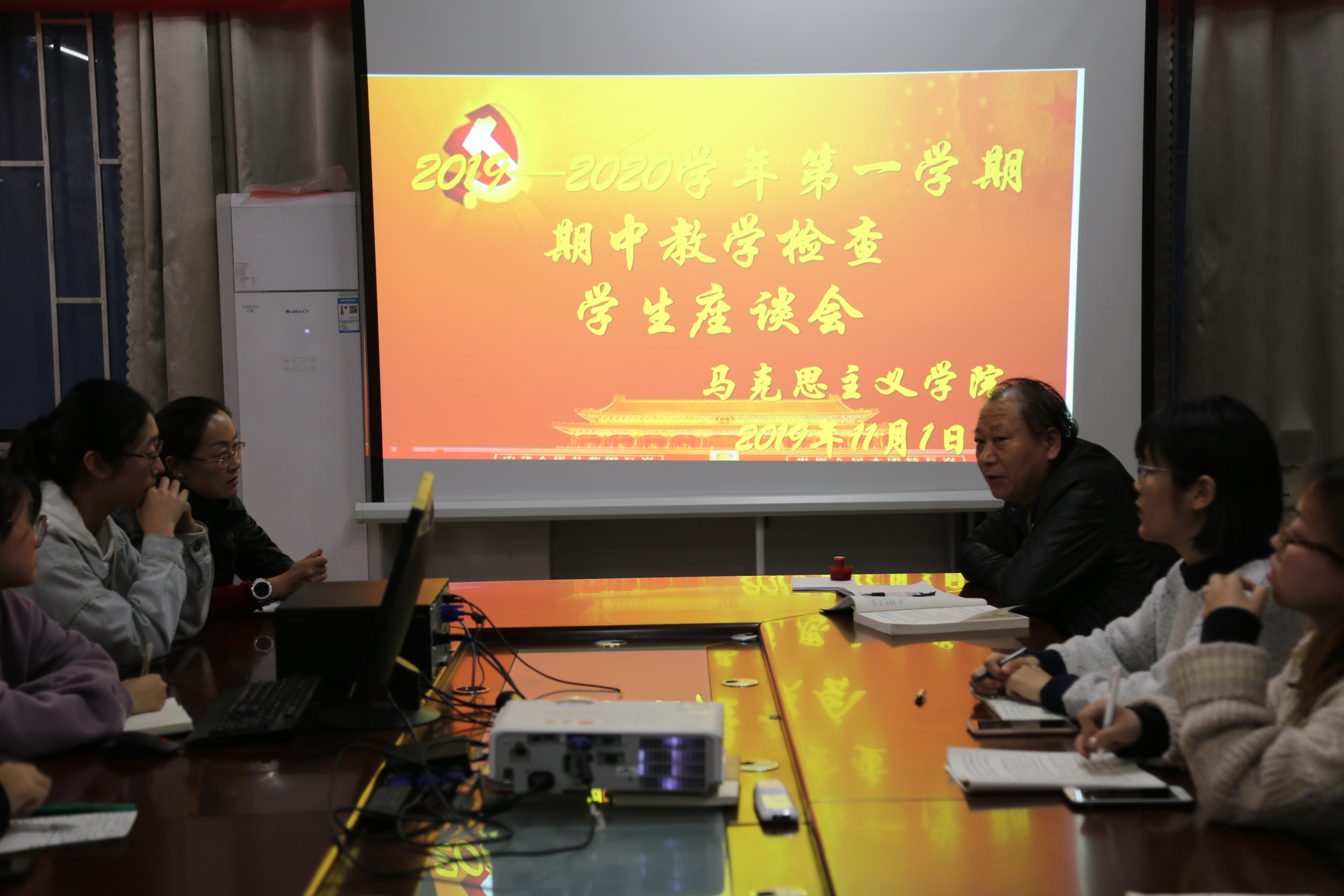 为不断提高教育教学水平和人才培养质量,促进教学管理规范化常态化制度化,加强学生学风建设,营造良好的学习氛围,马克思主义学院于2019年11月1日下午在齐贤楼2501教室召开2019—2020学年度第一学期期中教学检查学生座谈会。马克思主义学院院长刘勇,学生工作办公室主任赵静,各班班长、学习委员以及学生会学习部的成员参与本次座谈会。