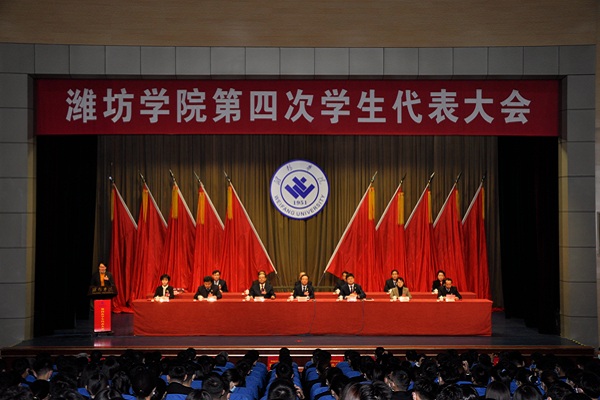 12月13日,潍坊学院第四次学生代表大会在图书馆报告厅召开。学校党委书记李东、校长冯滨鲁、党委副书记王清明、副校长丁子信、潍坊团市委书记赵中国、潍坊团市委学少部部长王海燕出席开幕式。学校有关部门负责同志,各学院党总支书记、副书记,各学院团总支书记、副书记应邀出席开幕式。大会正式代表、列席代表和部分学生,共计300余人参加了大会。