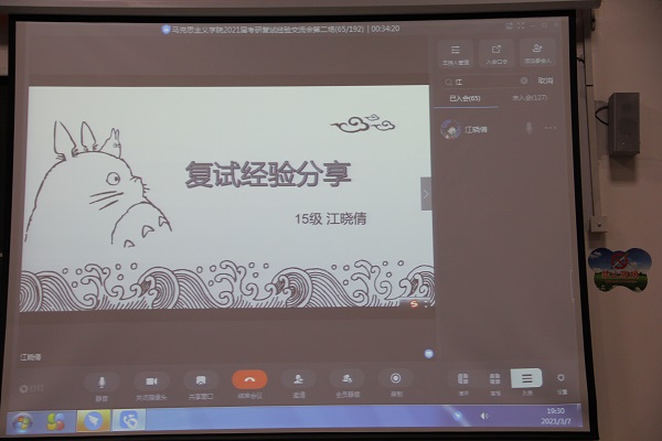 2021年全国硕士研究生招生考试复试时间陆续公布,为做好研究生复试指导工作,加强学生对考研知识和经验的了解,营造积极向上的学风,为学院正在备考的同学加油鼓劲,3月9日晚7点,马克思主义学院在2109教室通过钉钉会议举行了第二场考研复试交流会。此次交流会诚挚邀请马克思主义学院2015级毕业生石涵、江晓倩,2016级毕业生张敏、张新艳、徐梦、刘玉珂、赵雪梅、于海洋,为同学们分享考研复试经验。张旭冉主持本次会议。