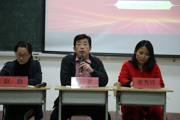 为推进大学生思想政治教育和管理服务工作高质量发展,部署学期学生工作,提高学生学习工作自主性,2021年3月25日18:20,马克思主义学院于2109教室召开了马克思主义学院全体学生大会,党总支副书记王胜出席会议并讲话。学生工作办公室主任、团副总支书记专职辅导员赵静、崔秀玲出席本次大会。