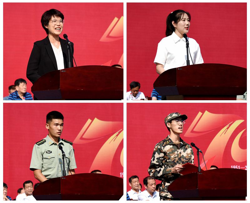 山东省第六届“超星杯”高校青年教师教学比赛一等奖获得者,经济管理学院黄雷老师、教官代表一营一连连长姜承奇、特教幼教师范学院学前教育专业2019级学生郑彤彤、化学化工与环境工程学院环境工程专业新生张旭分别作了精彩发言。