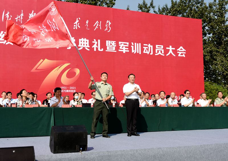 党委书记李东向军训团授团旗。