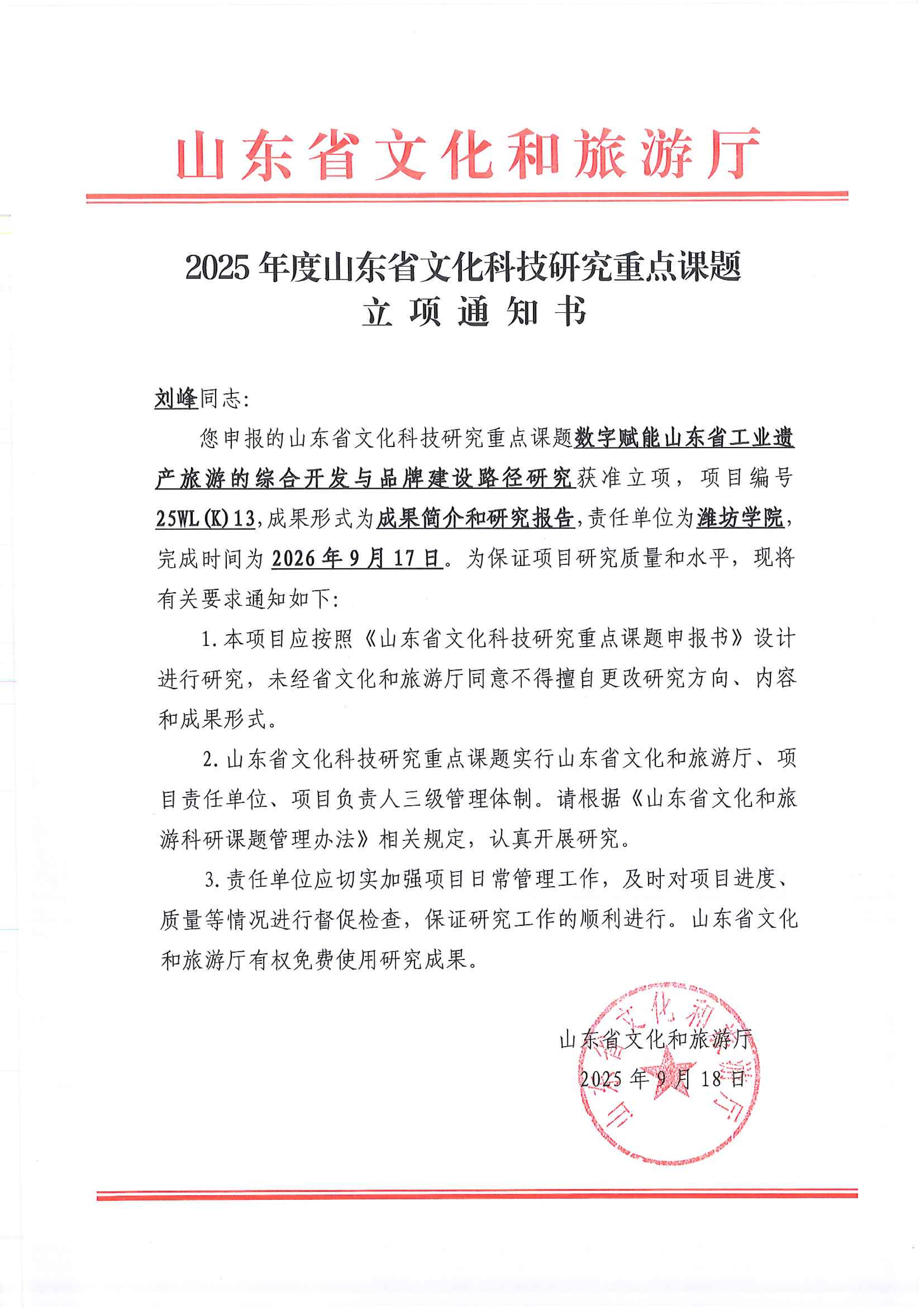近日,山东省文化和旅游厅正式下达2025年度山东省文化科技研究重点课题立项通知,全省共评选出40项重点课题。我院刘峰博士申报的《数字赋能山东省工业遗产旅游的综合开发与品牌建设路径研究》成功获批立项。