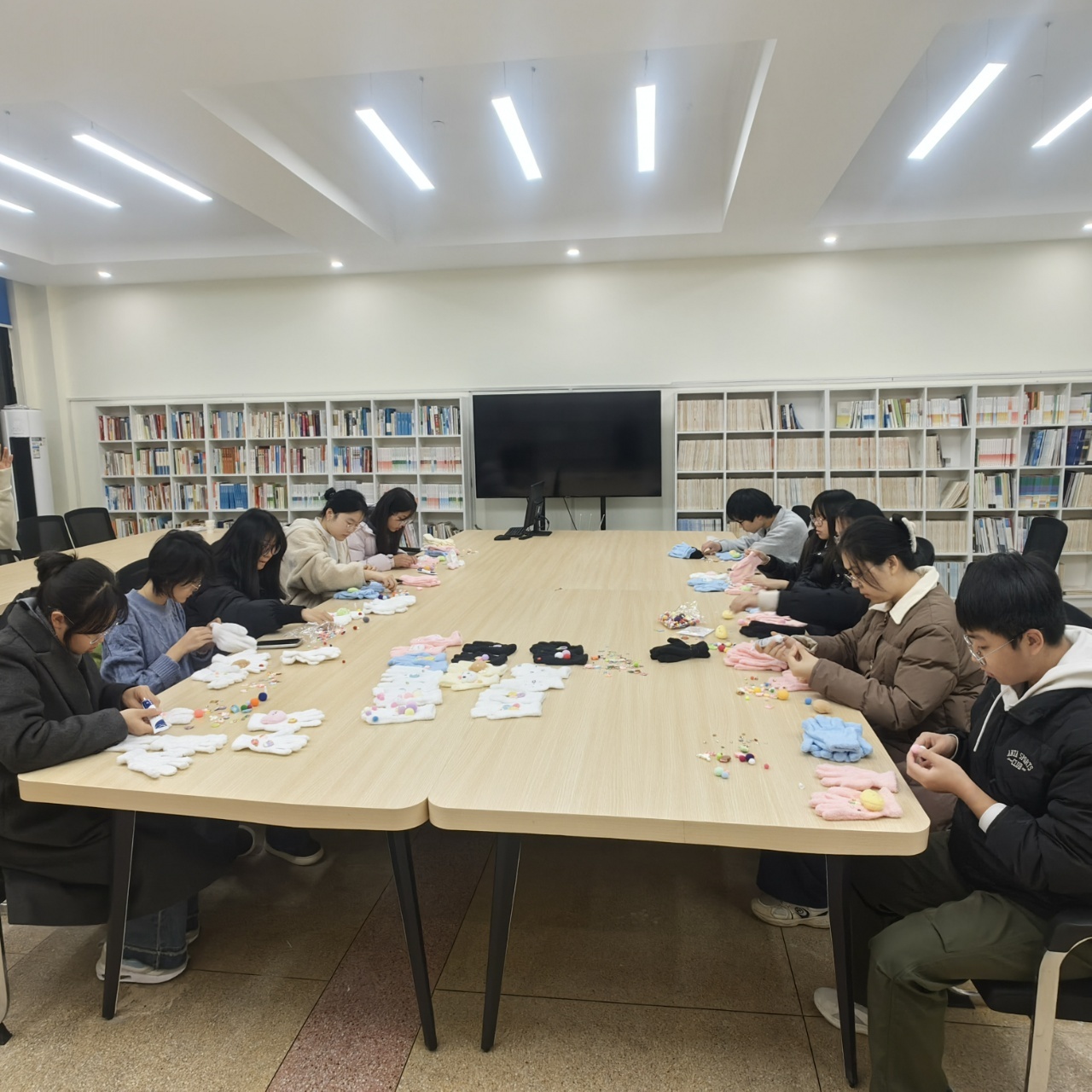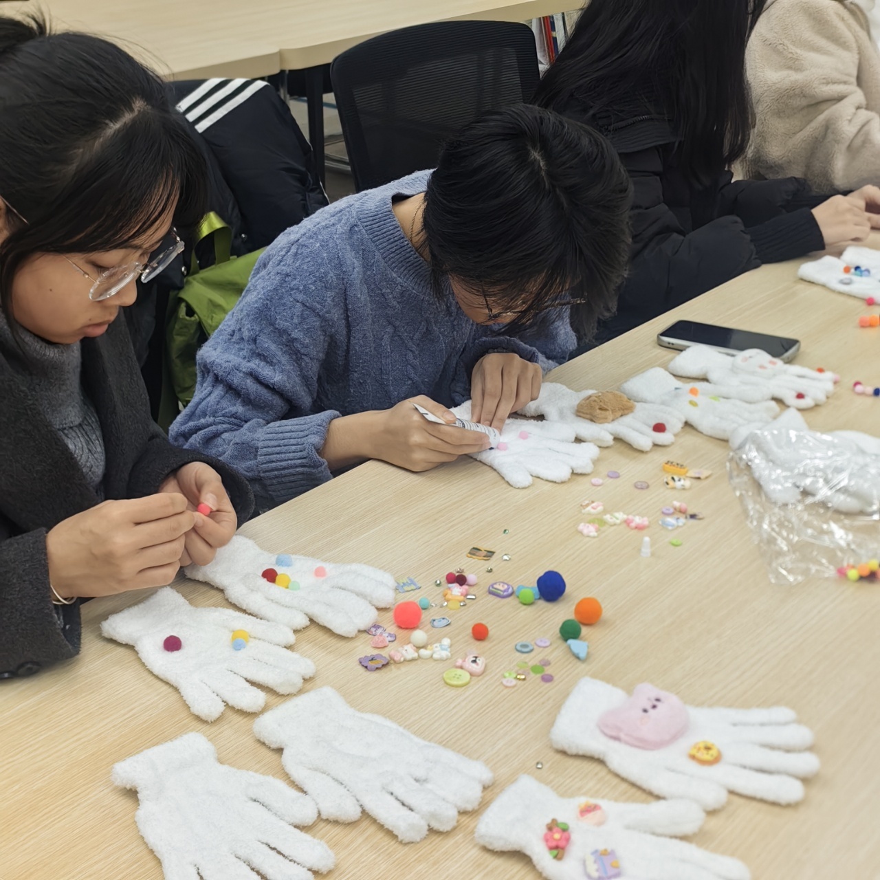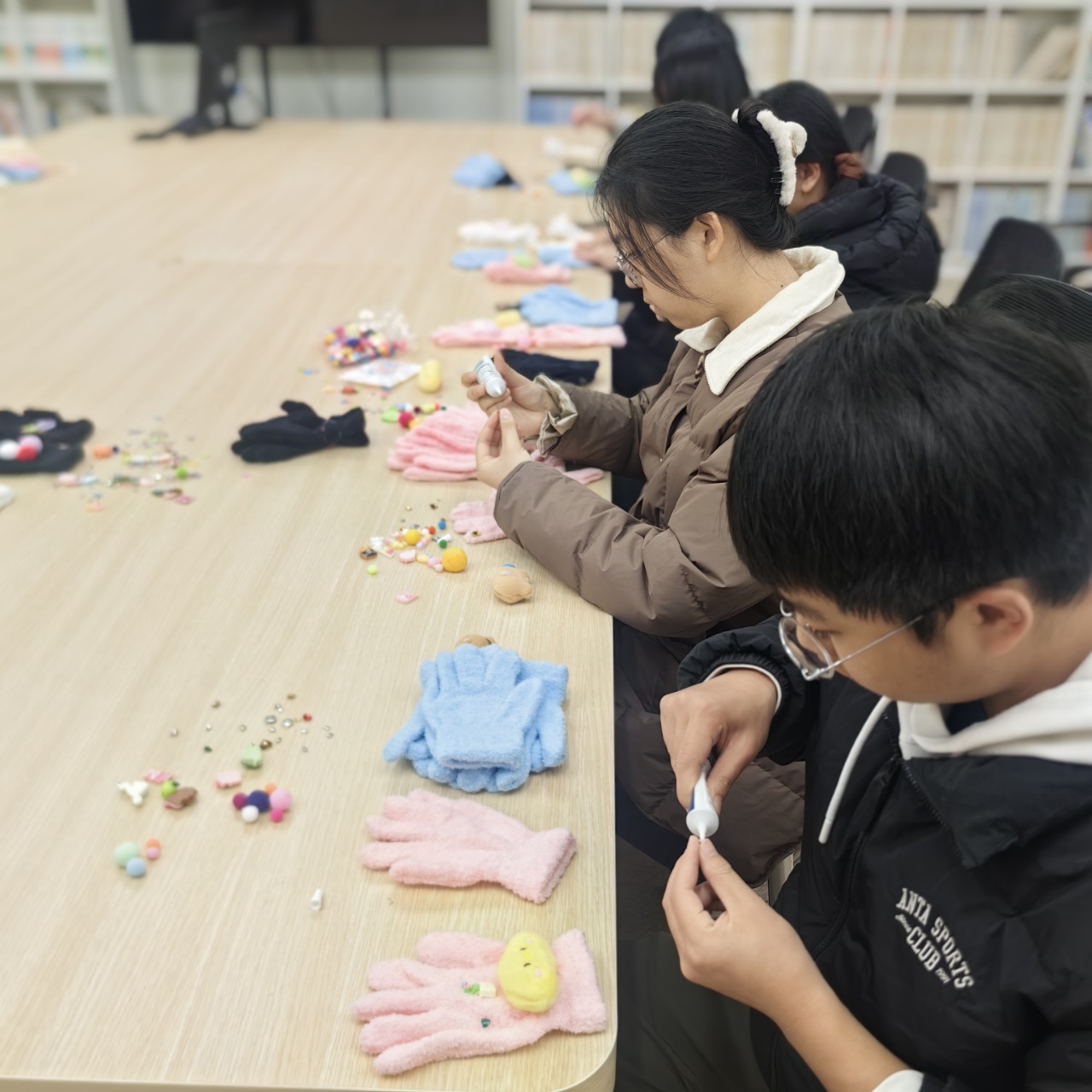 创作过程中,大家以针织手套为载体,巧用刺绣贴、胶水等材料,将“爱心”“纽带”等帮扶意象,与“笑脸”“阳光”等温暖元素巧妙融合,设计出兼具实用性与心意的专属手套。这些满载诚意的作品最终将全部赠予受助学生,让学院的关怀变得可触可感。