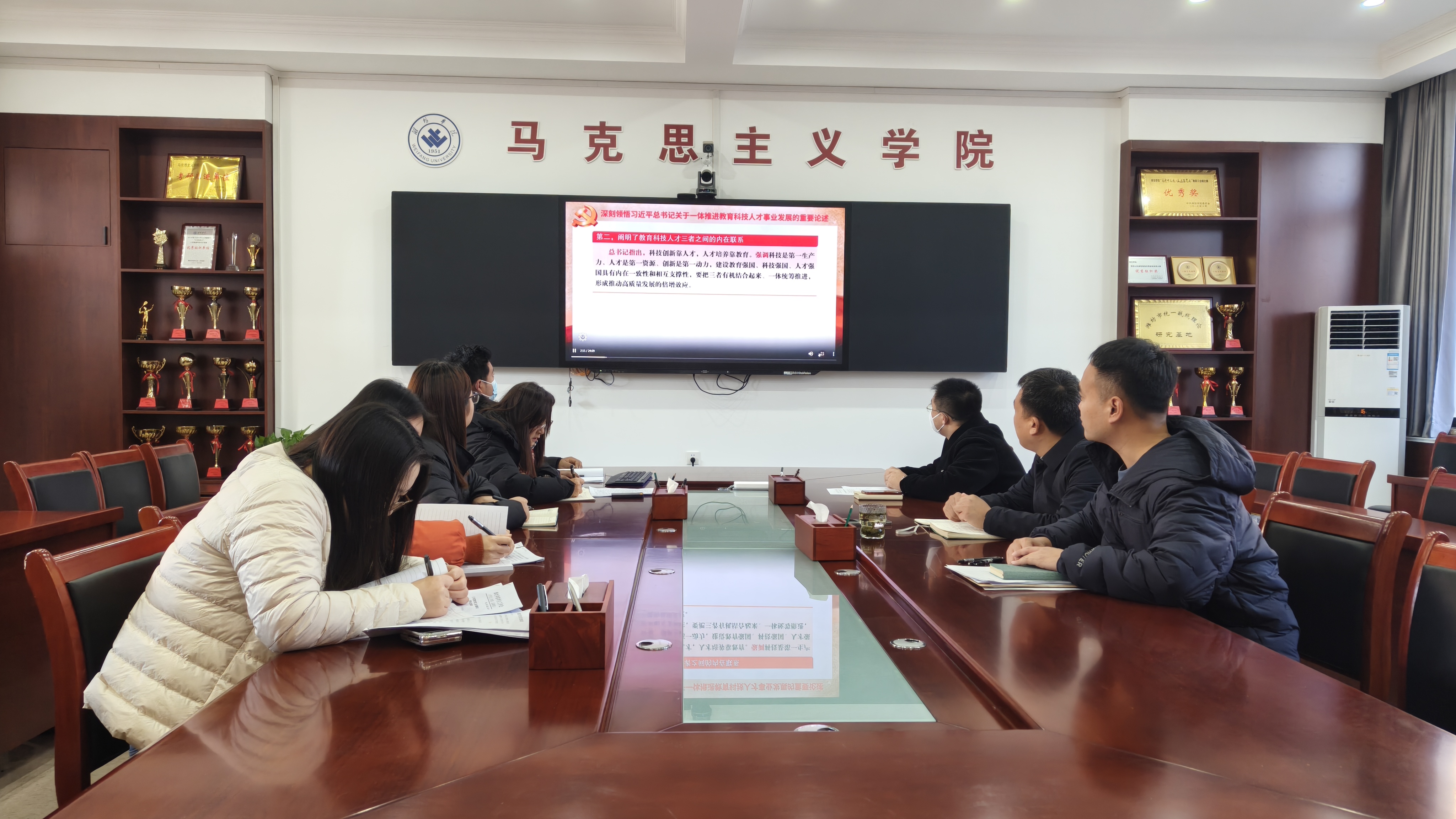 与会人员集体观看了教育部政策法规司司长张文斌主讲的“一体推进教育科技人才事业发展”网络课程。观看结束后,中心组成员结合马克思主义理论学科特点与学院发展实际展开了深入讨论。大家一致认为,《习近平谈治国理政》第五卷全面系统反映习近平新时代中国特色社会主义思想最新成果。作为马克思主义理论教学与研究的重要阵地,学院应带头深入学习,将其作为理论研究和教学的重要内容。