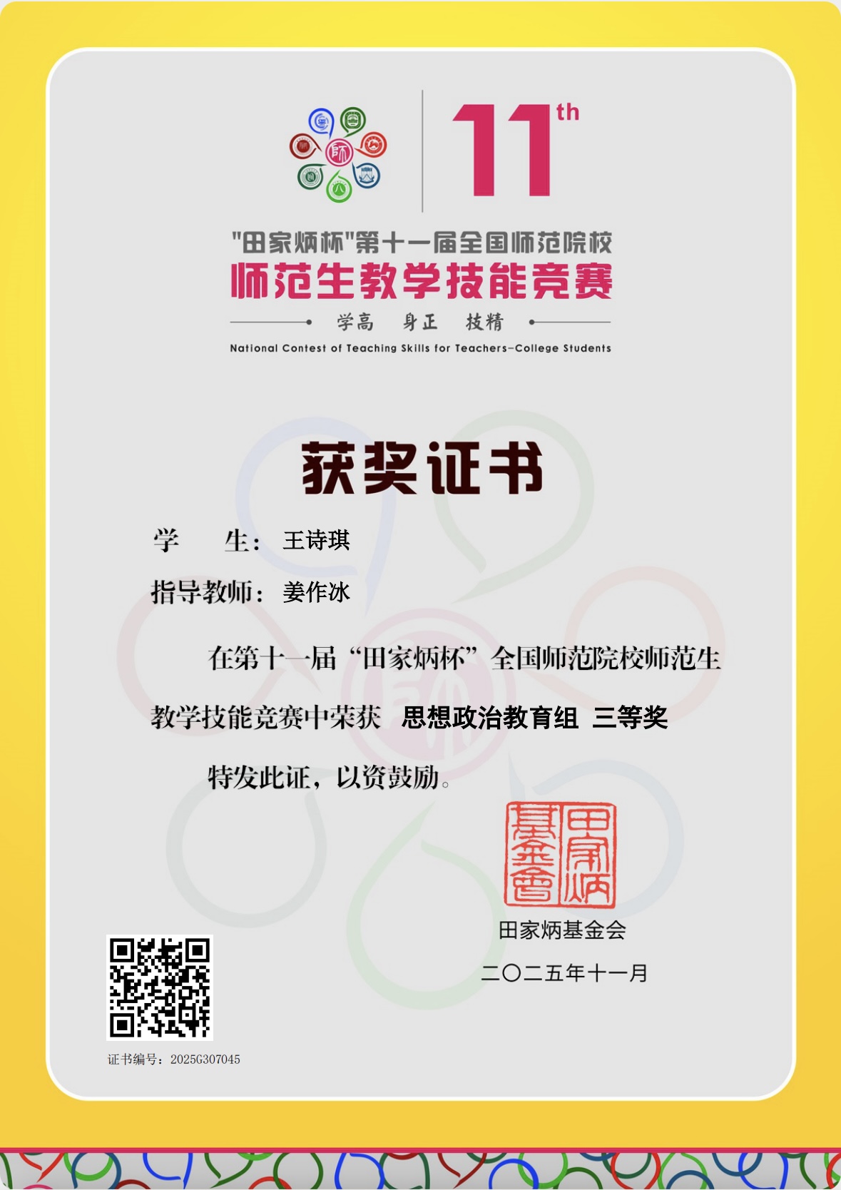 近日,第十一届“田家炳杯”全国师范院校师范生教学技能竞赛落下帷幕。学院2023级思想政治教育专业王诗琪同学,荣获思想政治学科三等奖。