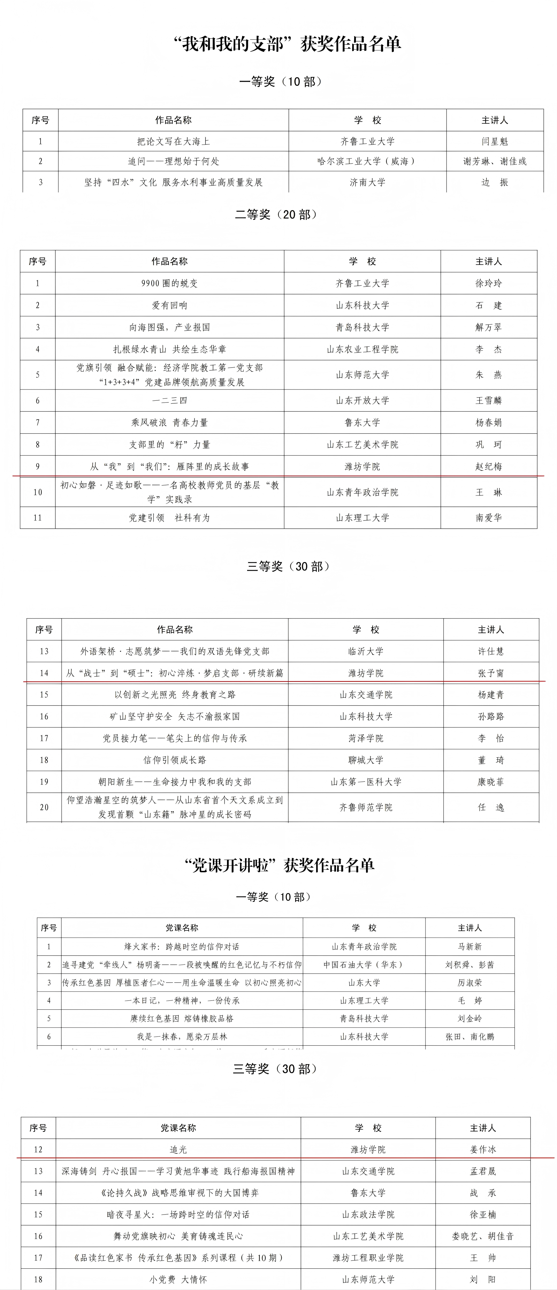 此次评选工作由中共山东省委教育工委组织开展,经高校推荐、专家评审、网上公示等环节,共评选出“我和我的支部”优秀作品60部、“我来讲党课”优秀作品60部。