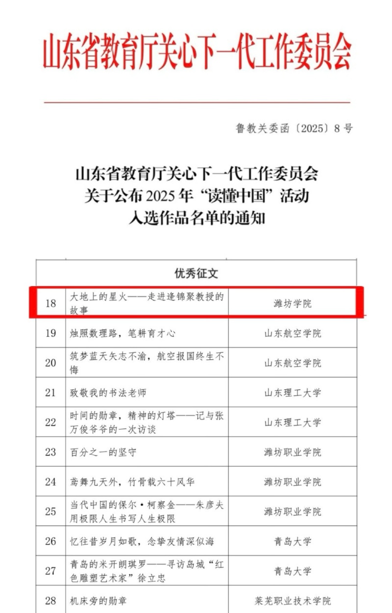 近日,山东省教育厅关心下一代工作委员会2025年“读懂中国”活动评选结果正式公布,学院2023级思想政治教育专业宋润同学的征文《大地上的星火——走进逄锦聚教授的故事》,在全省高校众多参赛作品中脱颖而出,获评优秀征文。