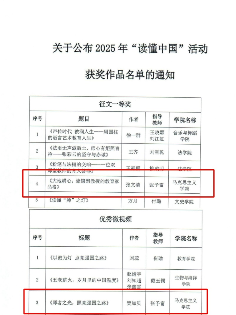 12月18日,山东省教育厅关心下一代工作委员会“读懂中国”比赛活动结果正式公布。学院张文清同学的作品《大地耕心:逄锦聚教授的教育家品格》荣获征文一等奖,贺加贝同学的作品《师者之光,照亮强国之路》荣获优秀微视频。