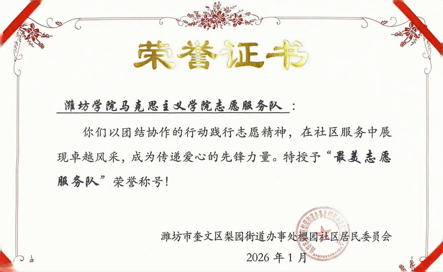 1月23日,樱园社区年度总结表彰大会顺利召开,学院求是志愿服务队荣获“最美志愿服务队”称号。这不仅是对服务队深耕社区志愿服务工作的高度肯定,也为校社携手前行增添新注脚。