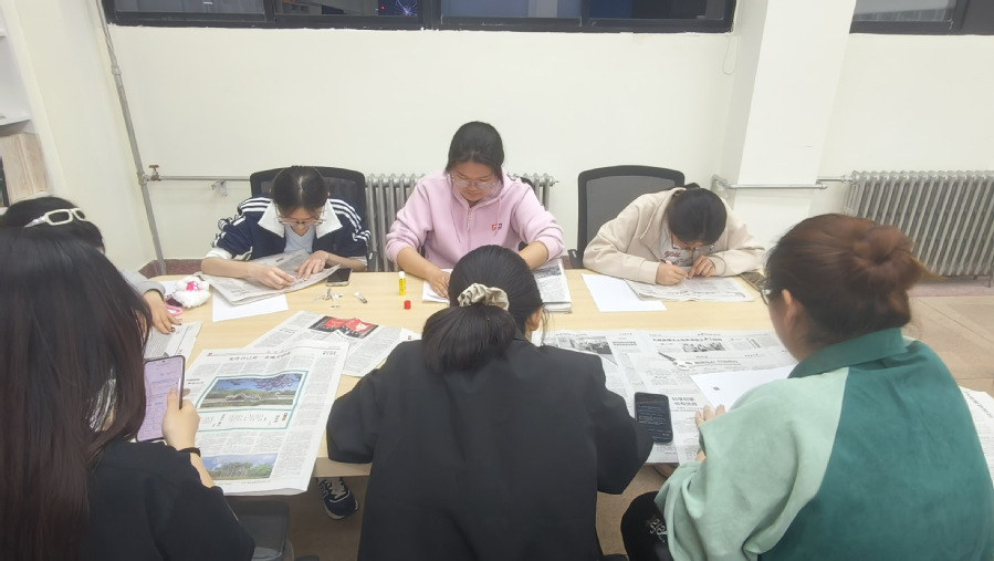 活动现场,学生们以旧报纸为核心材料,自主选字、裁剪、重组,拼接文字片段,创作出有意蕴的短诗。大家自主构思、交流创作,不仅锻炼了动手与创意表达能力,更深化了对文字之美的认知。后续,学院将挑选优秀作品在二楼长廊展出,供师生交流欣赏。