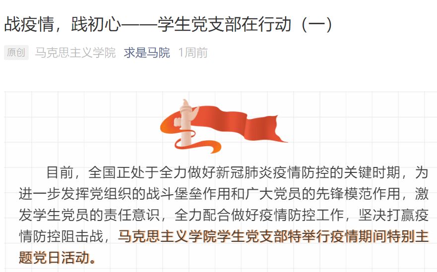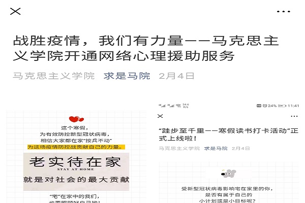 积极利用公众平台——求是马院微信公众号以及筑梦马院微博公众号对一系列活动进行宣传。系列活动传递着我们的信心勇气以及责任意识。虽形式不同,丰富多彩的活动却都有同一个目的:抗击疫情,我们始终在一起努力。