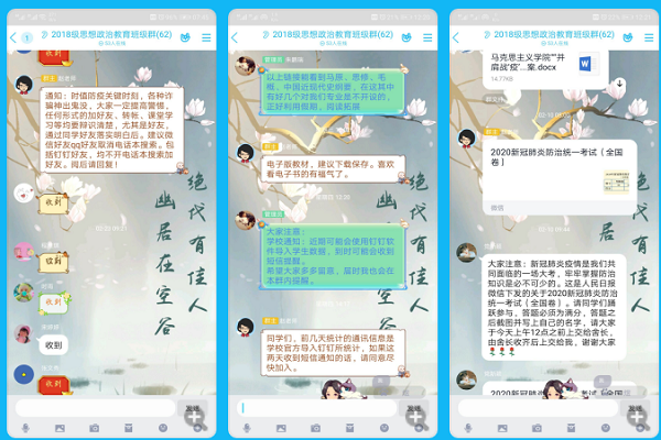 因为疫情的缘故,新学期无法按照原计划开学,开学延迟,但学习从来不会迟到。为响应“停课不停学”的号召,顺利完成本学期教学计划,保障同学们在疫情延期开学期间获得更多知识,按照学校安排,马克思主义学院积极利用线上平台开展线上教学。