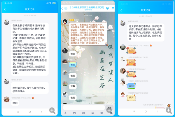 开课前,老师们积极准备课程资料,学习平台操作等,学院汇总各学科线上课程安排,班委按照课程要求提醒同学们按时进入班级群聊,及时做好线上开学准备。同时,辅导员对同学们在线上教学提出要求,要求同学们遵守学校有关学生管理的相关要求和规定,规范课堂秩序,保证线上教学有序开展。