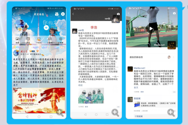孟涵乐同学在空间动态中说:“雷锋精神,是以雷锋的名字命名,是在实践中不断丰富和发展着的革命精神。其实质和核心是全心全意为人民服务,为人民的事业无私奉献,它已经成为我们这个时代精神文明的同义语、先进文化的表征。”这是同学们对于雷锋精神内涵的理解。吴君婷同学在文章中说:“面对疫情,主动投身抗疫一线的志愿者们,作为新时代雷锋精神的传承者,他们用自己的实际行动书写着这场战斗中的志愿力量,用心演绎着新时代最好的文明实践。广大医护人员冲锋在一线,发扬雷锋精神,用信仰照亮战‘疫’前行路,用行动凝聚起战‘疫’中的磅礴力量。”这是同学们抗疫阶段对雷锋精神最好的诠释。