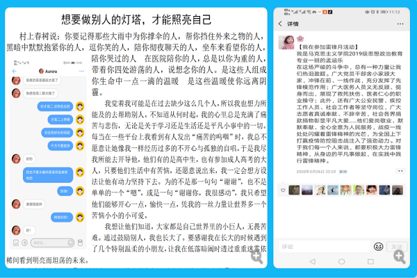 活动通知下发后,各位宣传委员积极动员学生们参与活动,而同学们也纷纷表现出出他们的热情,报名参与此次活动。基于疫情期间活动不方便,大家在网上开展活动,同学们通过发朋友圈、发动态的方式,展现他们学雷锋、践行雷锋精神的事迹、行动,通过视屏、图画、文字等方式,在朋友圈进行了事迹分享,这样就可以更好的传播雷锋精神,让更多的人行动起来。其中贺延斌同学说道:“雷锋把有限的生命投入到无限的为人民服务之中的一生,雷锋是我们的好榜样。”雷锋就在我们身边,我们不仅要以生活中的“雷锋”做榜样,我们还要学会从点滴做起、从自己做起、从当下做起。