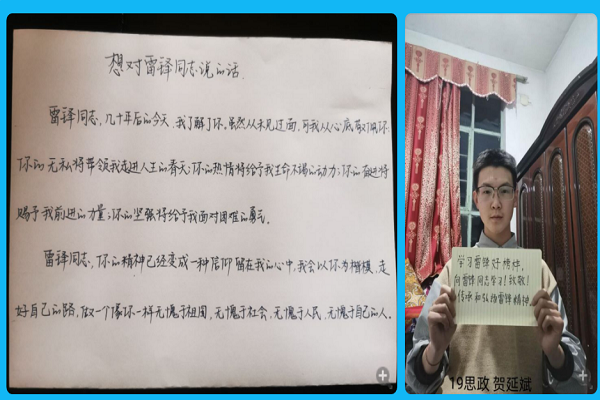 本次活动结合当前实际情况,采用线上方式进行。各班班委按要求通知每位同学,并积极动员同学们参加此次活动。同学们通过写下自己想对雷锋说的话或与雷锋精神有关的话,制作图片等方式来表达自己对于雷锋同志的敬仰和继承发展雷锋精神的决心。图片中充分展现了雷锋精神,这种精神激励着一代又一代青少年健康成长:言行一致,不图名利,始终如一,始终把为人民服务放在心上。同学们表示,在学习生活中,每位同学对雷锋精神有不同的理解和传承,但同学们对于雷锋的敬仰是相同的,这对于凝聚同学们的意志和力量,在抗击疫情,停课