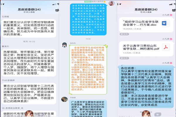 2020年4月7日至4月8日,潍坊学院马克思主义学院各年级班委召开班级会议,院学生会副部及以上成员也在部长群里开展了“关于认真学习贯彻山东省学生联合会第十二次代表大会精神的通知”钉钉语音会议。2016级思想政治教育1班班长鲁璇主持会议学习,班委同学在班委群发布自己的学习感悟。团支书李晨曦发言道:树立正确的价值观,坚持正确的价值判断和价值选择。在实践中认识和发现真理,在实践中检验和发展真理。